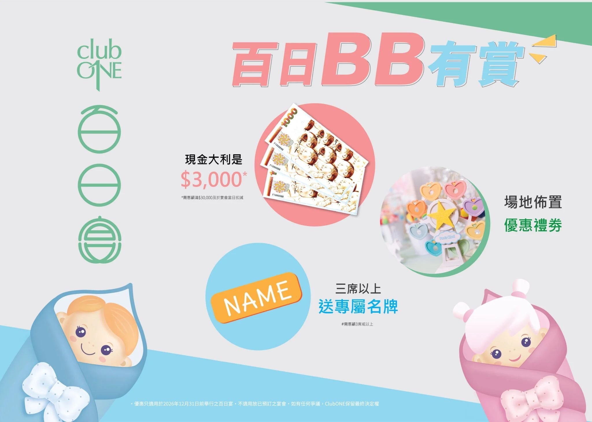 擺設滿月宴或百日宴,寓意寶寶百年長壽。ClubONE滿月宴/百日宴服務,最適合廣邀親友,分享添丁喜悅,歡迎查詢。